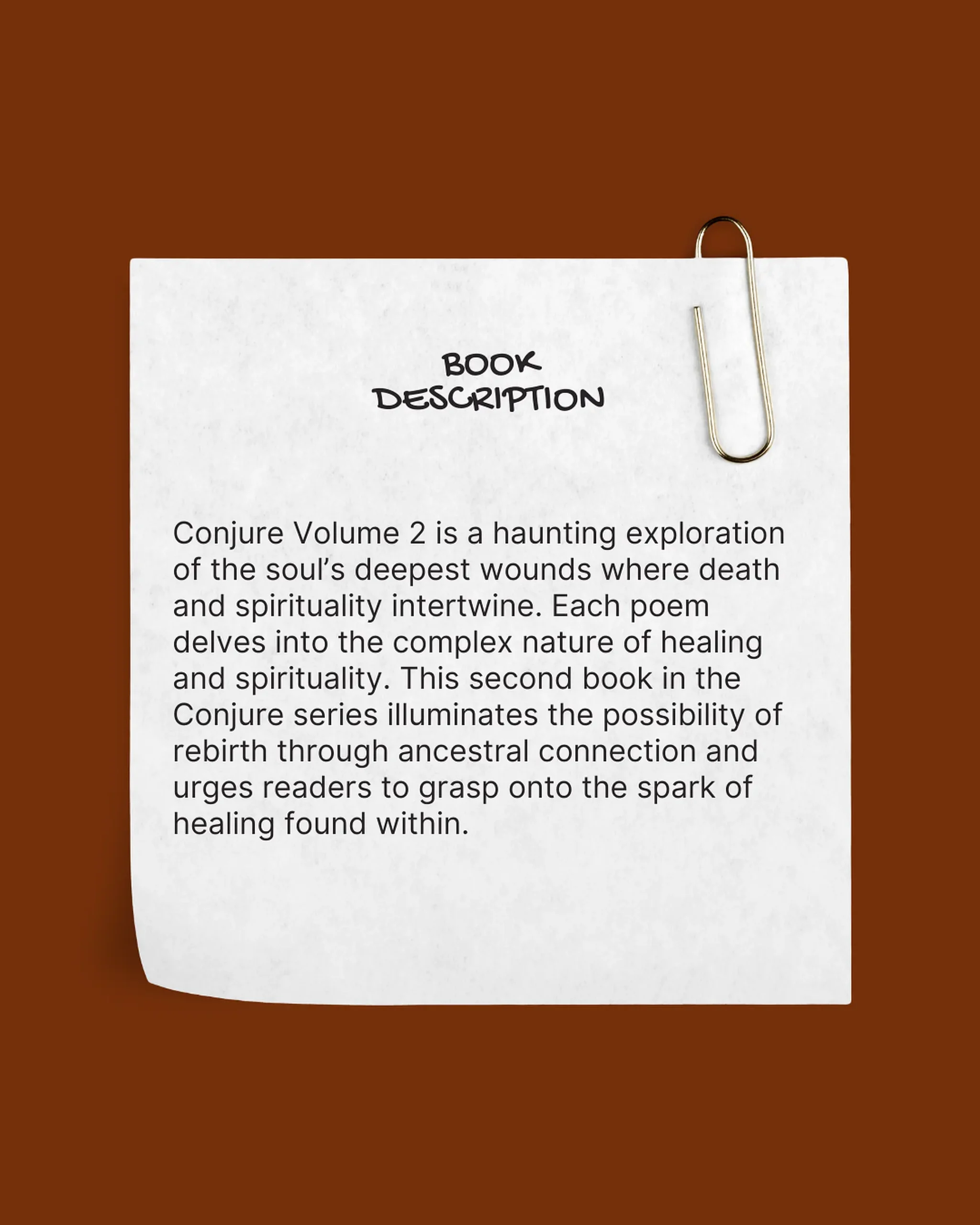 Conjure Volume 2 is a haunting exploration of the soul’s deepest wounds where death and spirituality intertwine. Each poem delves into the complex nature of healing and spirituality. This second book in the Conjure series illuminates the possibility of rebirth through ancestral connection and urges readers to grasp onto the spark of healing found within.